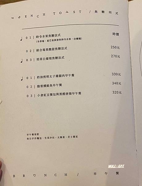 各種焦糖法式甜點及早午餐也是很棒的選擇,早午餐盤會附手作麵包、生菜沙拉、太陽蛋及芝士薯泥~