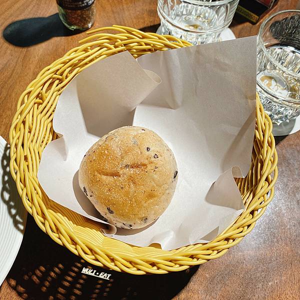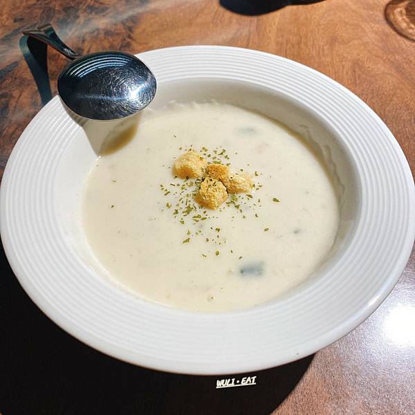 加購主廚套餐享有奶油巧達海鮮濃湯、麵包、沙拉,濃湯好喝,上面有麵包粒,裡面有馬鈴薯丁跟蛤蜊~很濃很好喝~