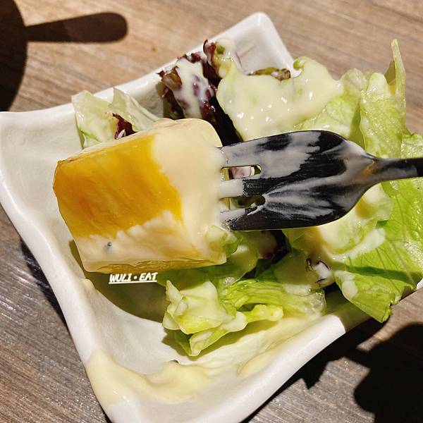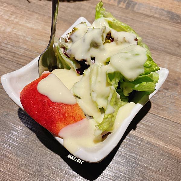 水果沙拉,有蘋果、鳳梨、火龍果,沙拉醬是百香果優格醬的感覺,酸甜好吃,而且醬給好多XD 不過生菜有吃到幾片苦苦的~