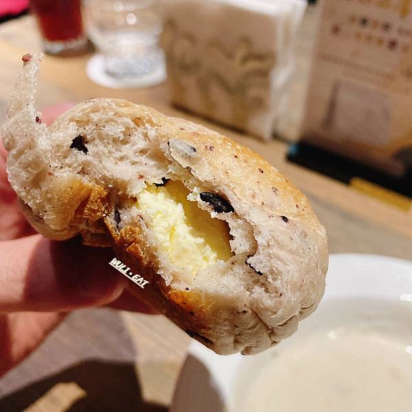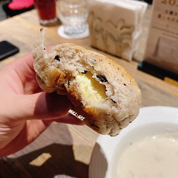 麵包是乳酪麵包,嚼起來吃的到麵粉香,搭配甜甜的乳酪餡~好吃~