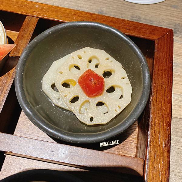 蓮藕片,上面是醃漬梅蜜番茄,甜甜的滋味搭配脆口的藕片~