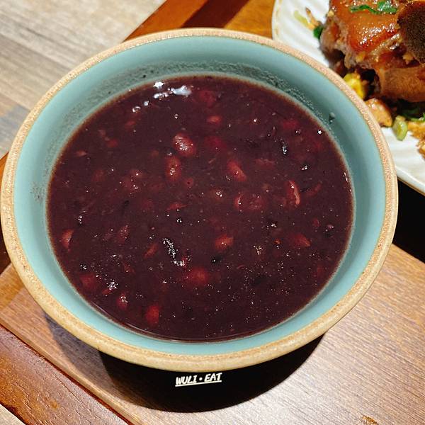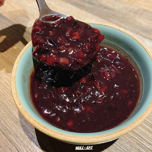 甜湯是紫米紅豆湯,是溫溫的,甜度很剛好,不會非常甜膩,剛剛好!