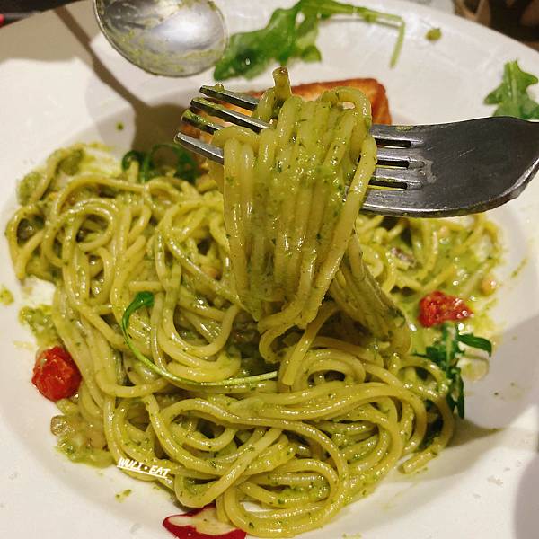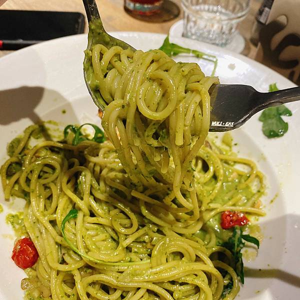 青醬的濃郁度剛好,不會太乾,也不會過於濕,收汁收得很剛好~麵的軟硬度也可以,而且份量很多~