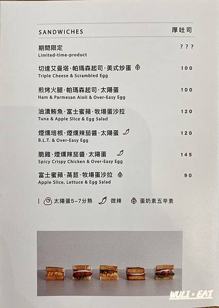 有奶油牧場蛋堡、厚吐司,口味的種類不到很多,不過不同口味的會搭配不同的蛋,有美式炒蛋、太陽蛋、蛋沙拉,覺得蠻用心在搭配的~